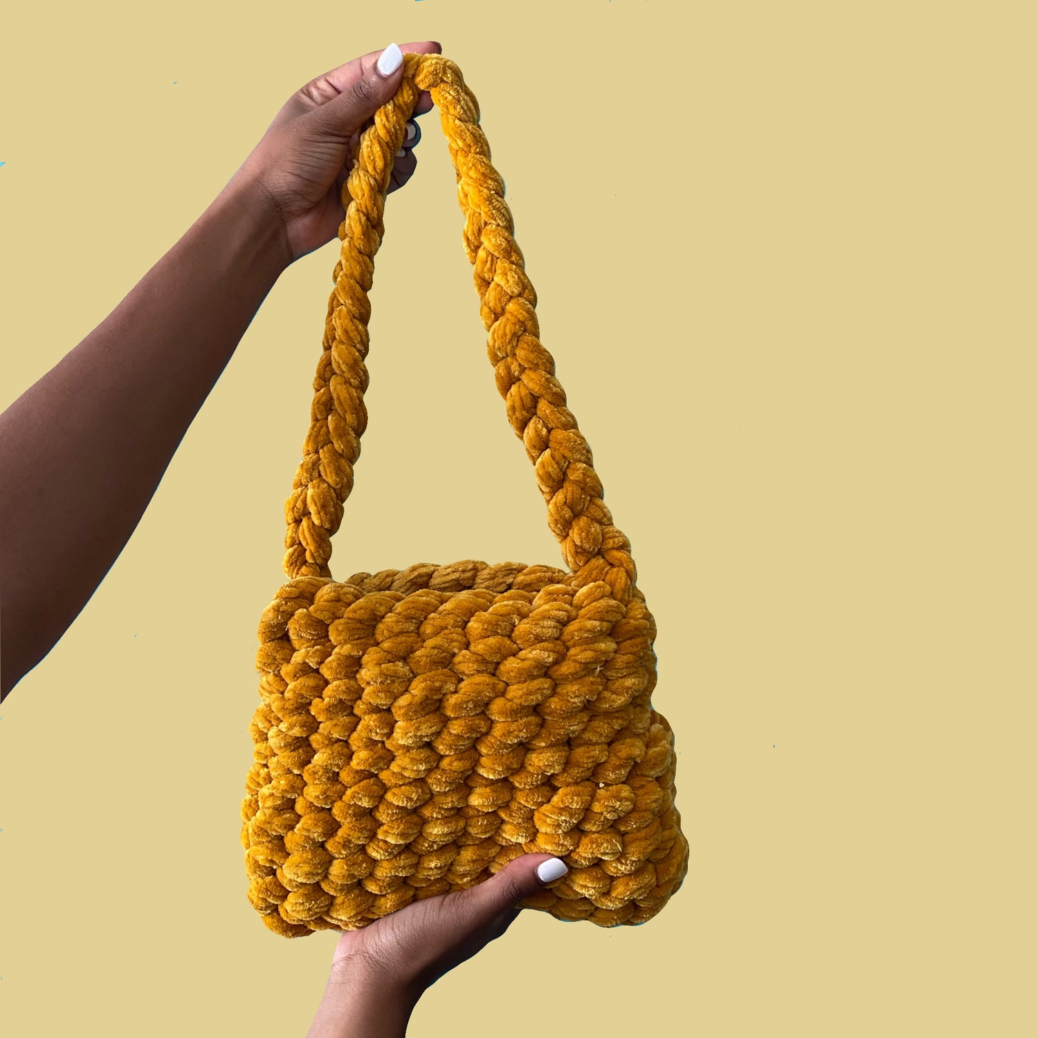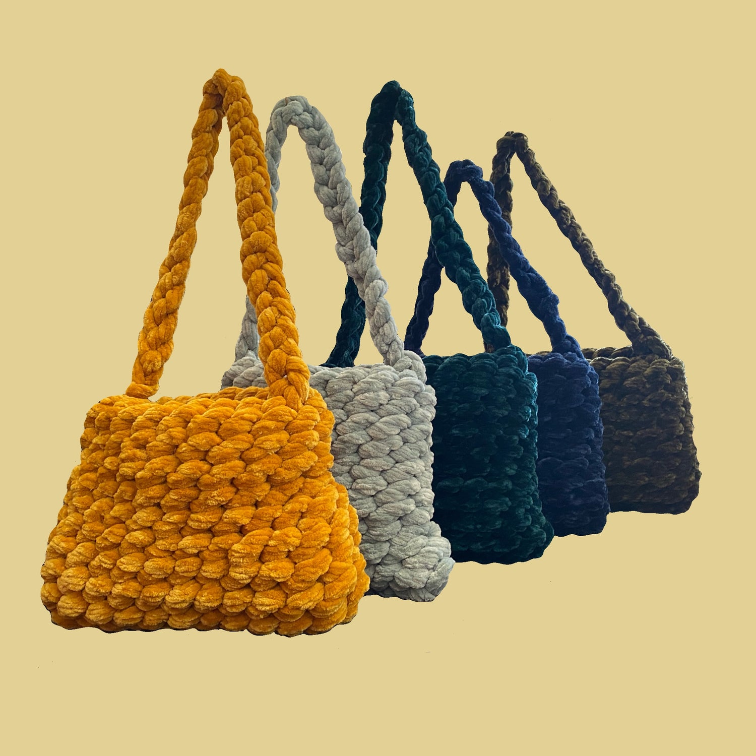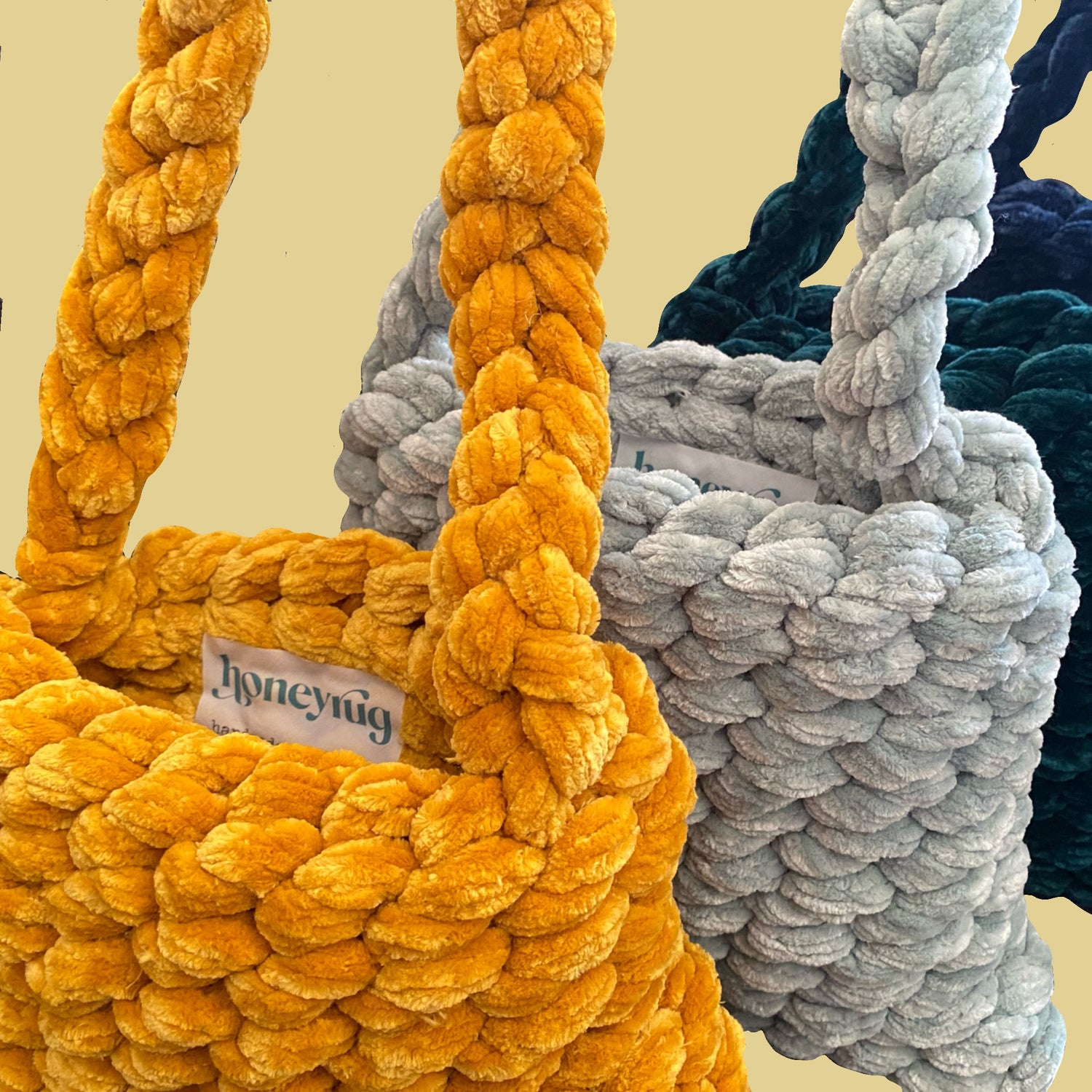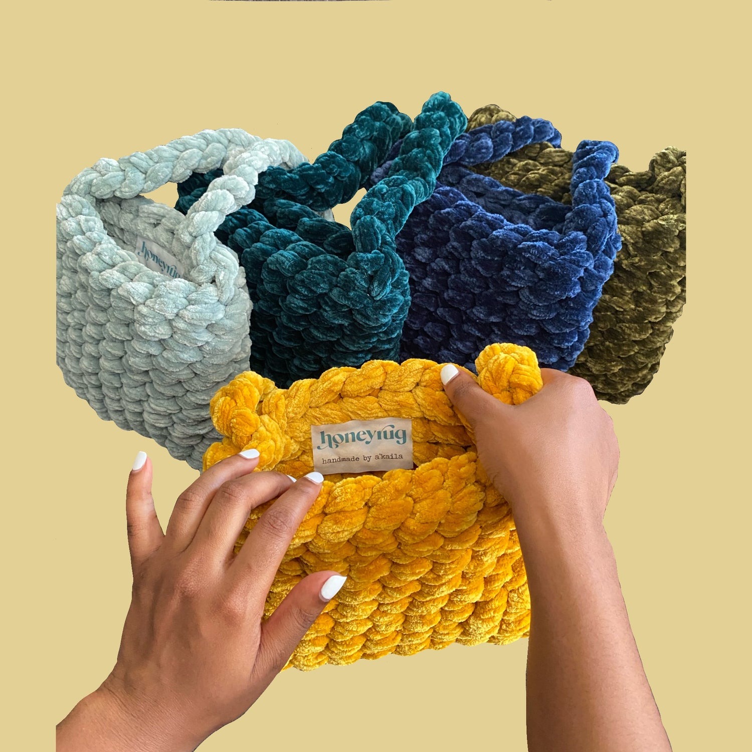 these pieces were finger-crocheted using our plush, velvet-like yarn; each embossed with our signature honeyrug logo